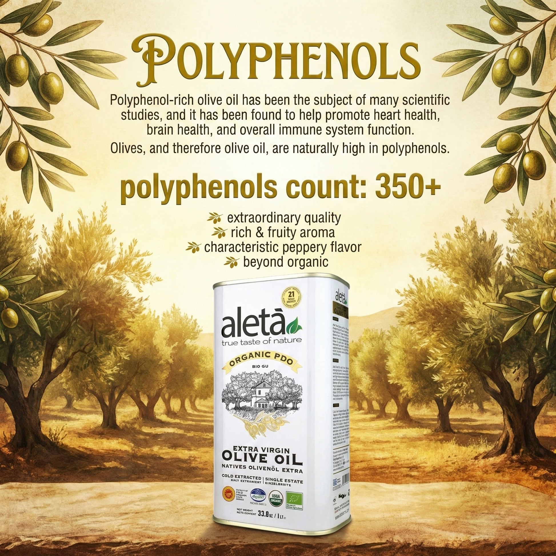 PROTECTIVE DESIGNATION OF ORIGIN “PDO”- Aleta Farms Organic Olive Oil is certified by the European Union as to the origin and to its quality, which meets the stringent requirements, while maintaining a focus on environmental consciousness and tradition. Fresh from the Groves this 100% Pure Greek Extra Virgin Ultra-Premium Olive Oil is known for its rich fruity aroma and a characteristic peppery flavor. Each bottle and tins are numbered in accordance with a strictly monitored procedure.
