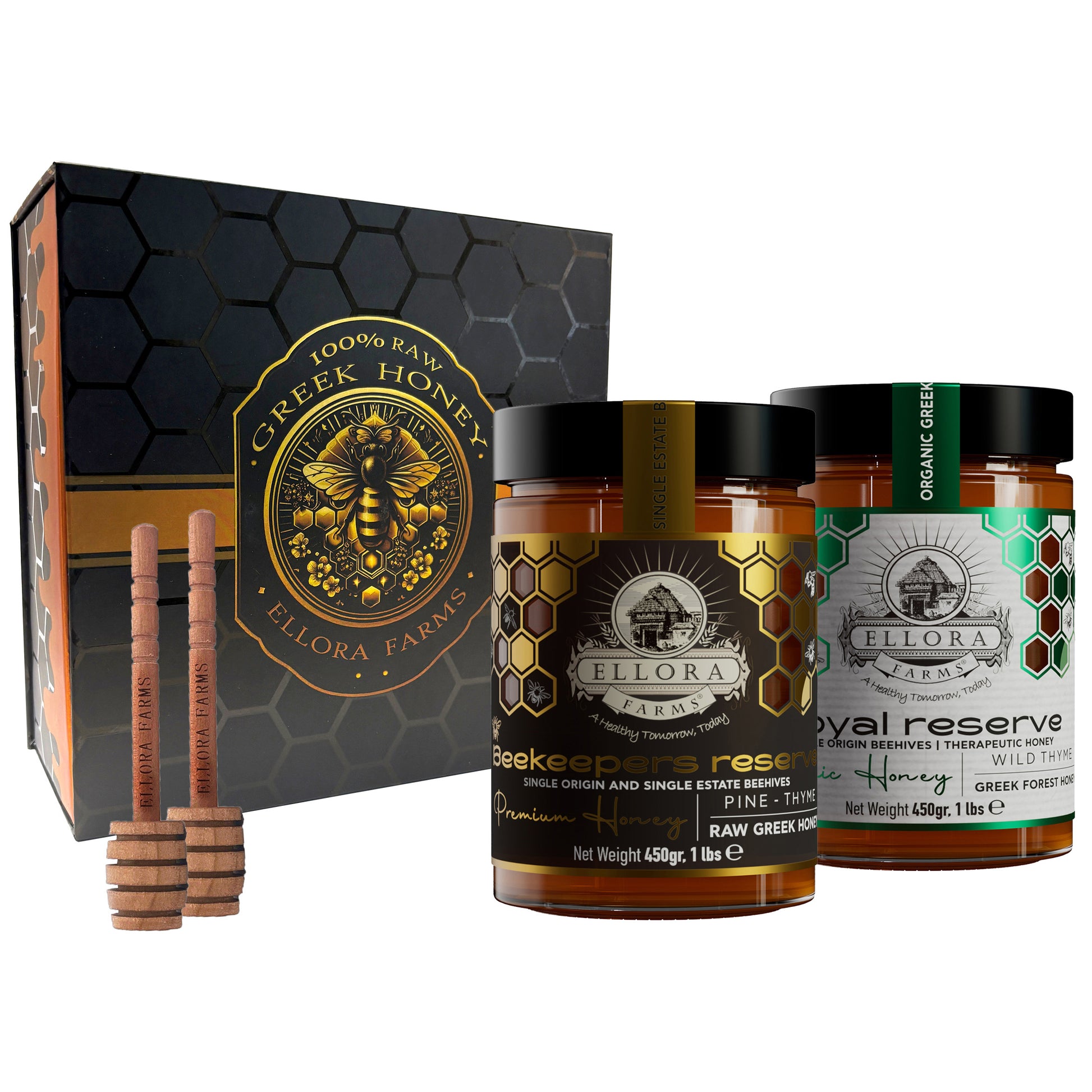 Organic Royal Reserve and Beekeepers Reserve PDO Single Estate Raw Greek Honey, 1 lb. Each Combo Gift Pack