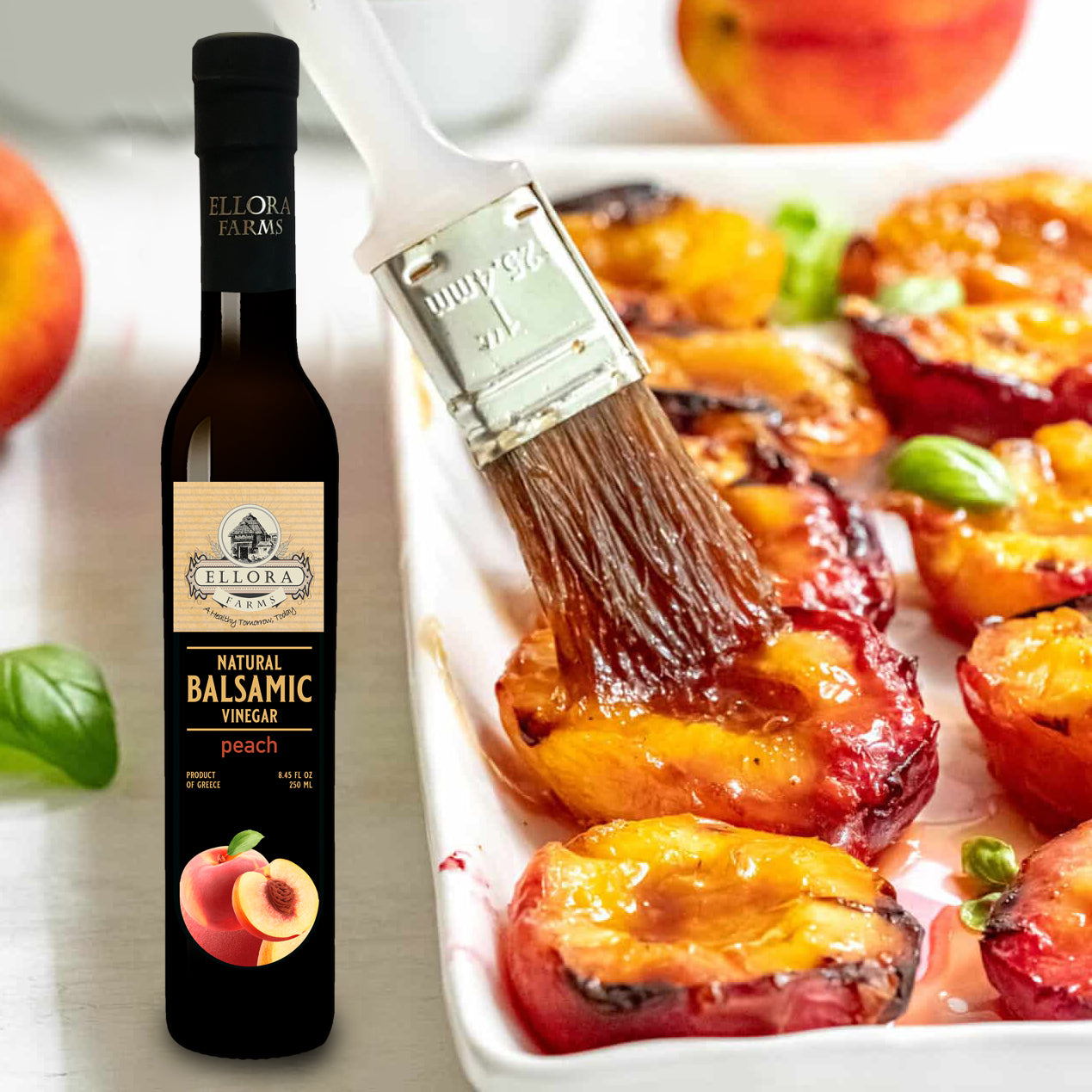 PEACH INFUSED BALSAMIC VINEGAR - Our Peach infused Balsamic crème is made from local Cretan recipe of reduced grape must and fresh peach. Originating from the ancient Isle of Crete in Greece this peach infused Balsamic is the perfect balance of fruity and tropical flavor. Enjoy with toasts, salads, yogurts, granola, sauces, marinades, grilled vegetables, and even ice-cream. A 100% natural product with no added sugar, sulfites, preservatives, or colorings.